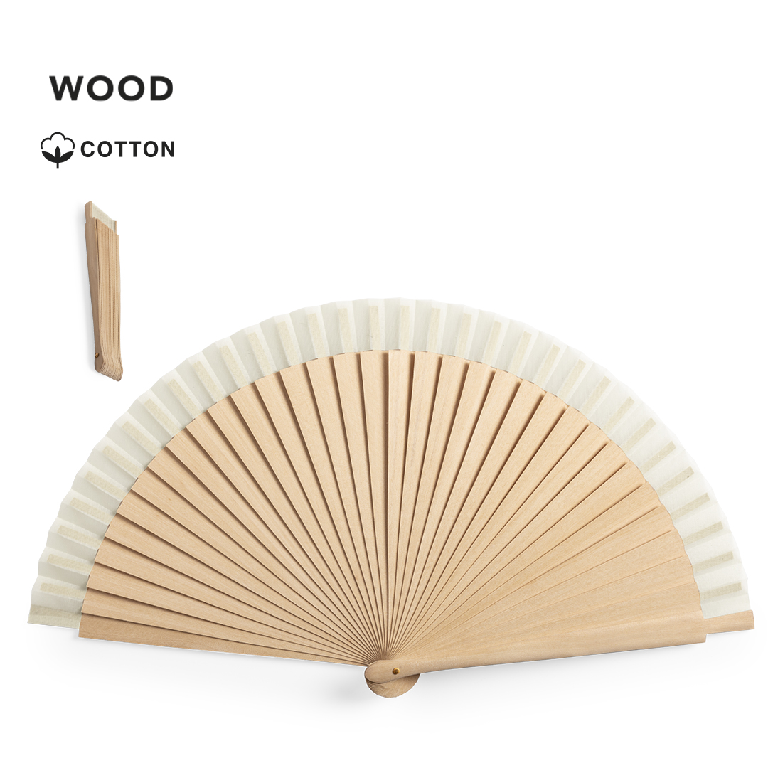 • Abanico fabricado con varillas de madera y tela en algodón en combinación con el poliéster.