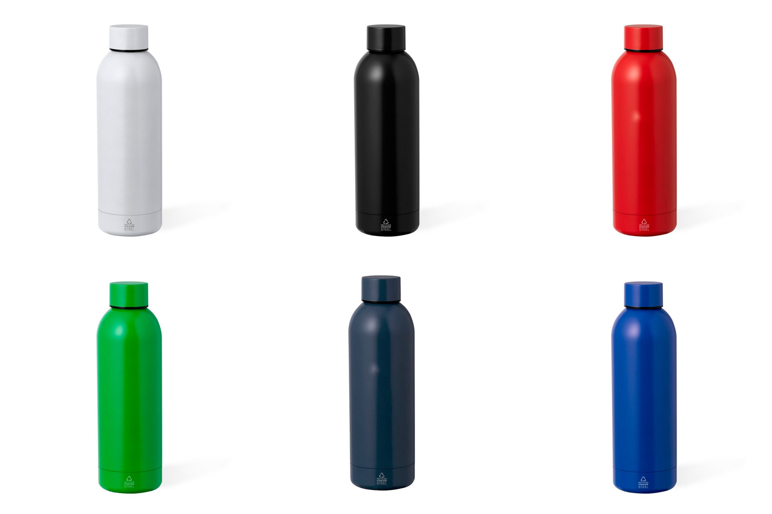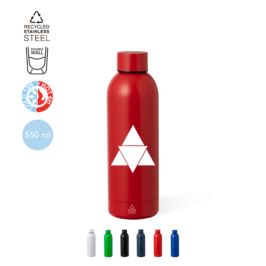 • Bidón térmico de doble capa en Acero Inox Reciclado de 550 ml de capacidad, disponible en variada gama de colores metalizados de acabado mate.