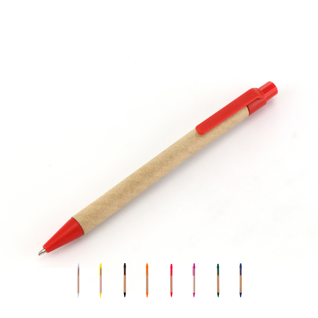 • Bolígrafo de mecanismo pulsador en original combinación de cuerpo en cartón reciclado de color natural y accesorios en vivos colores.