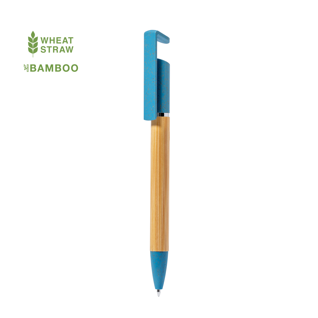 Práctico bolígrafo soporte fabricado en bambú y caña de trigo. Cuerpo en bambú, con accesorios en caña de trigo a color y elementos decorativos metálicos. De mecanismo giratorio, con soporte integrado en clip para dispositivo móvil. En tinta azul, con carga jumbo y disponible en variados colores.