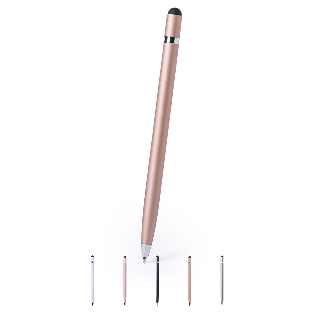 • Bolígrafo puntero de mecanismo giratorio con cuerpo en aluminio de suave acabado metalizado.