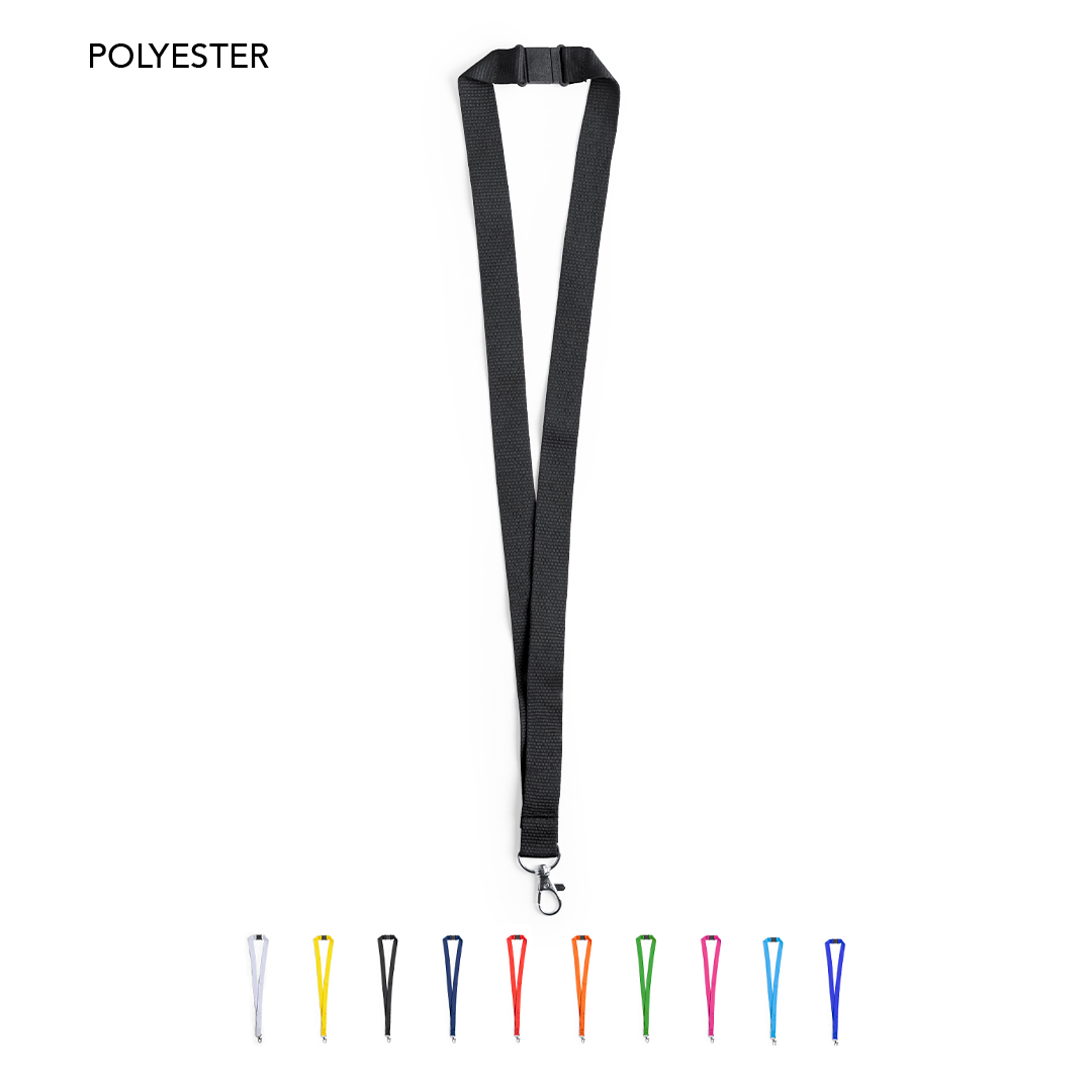 • Lanyard en resistente poliéster, con accesorio de seguridad en el cuello y mosquetón metálico.