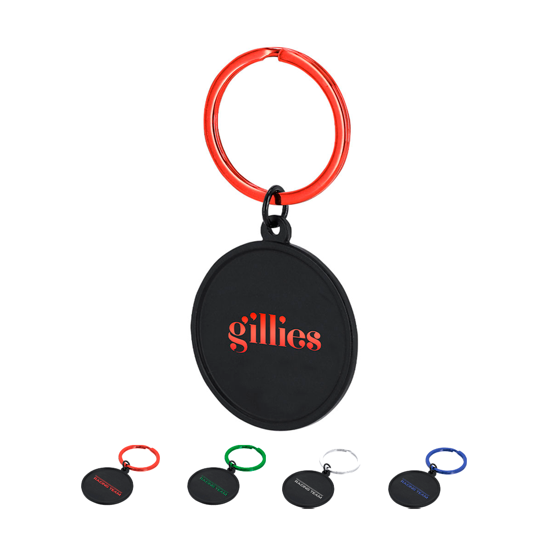 • Llavero elaborado en aluminio con diseño redondo en color negro.
