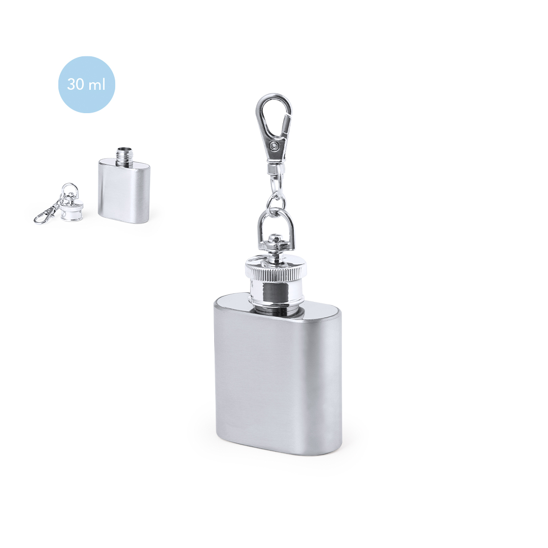 • Práctico llavero petaca fabricado en acero inox, de 30 ml de capacidad.