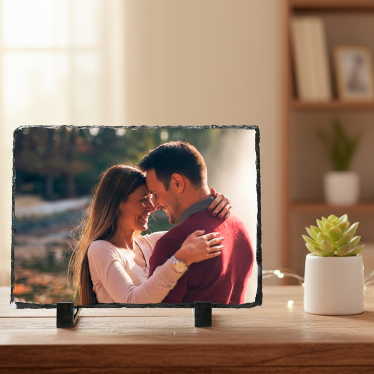 La piedra pizarra es un material natural que aporta textura y profundidad a tus imágenes. Nuestro proceso de impresión utiliza tecnología de vanguardia para asegurar que tus fotos se impriman con la máxima calidad y detalle en cada piedra.