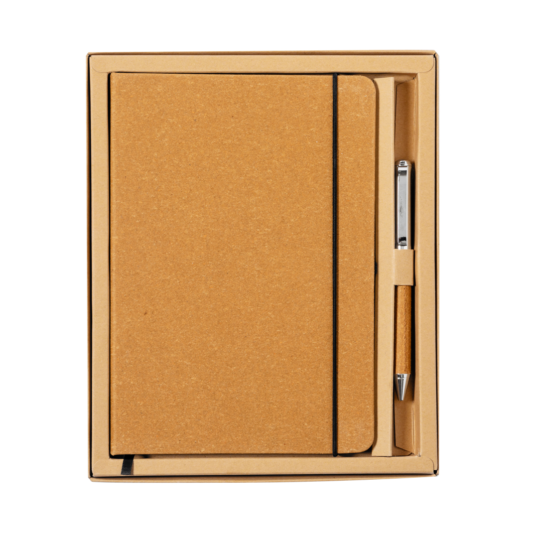 • Set presentado en estuche individual de diseño kraft, con compartimento independiente para bloc de notas y bolígrafo.