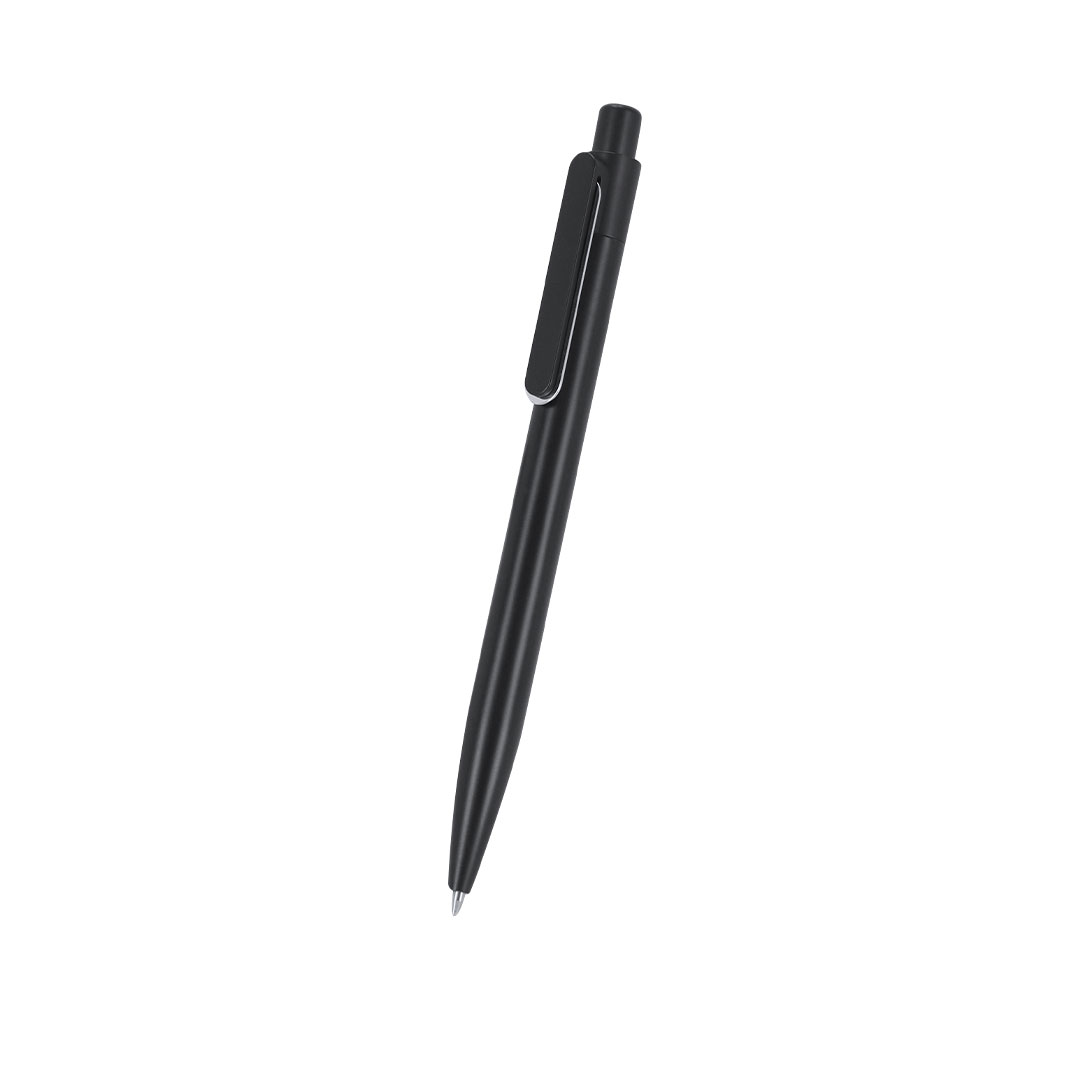 – Bolígrafo en negro mate fabricado en Aluminio Reciclado de mecanismo pulsador con clip y elemento decorativo en metal pulido.